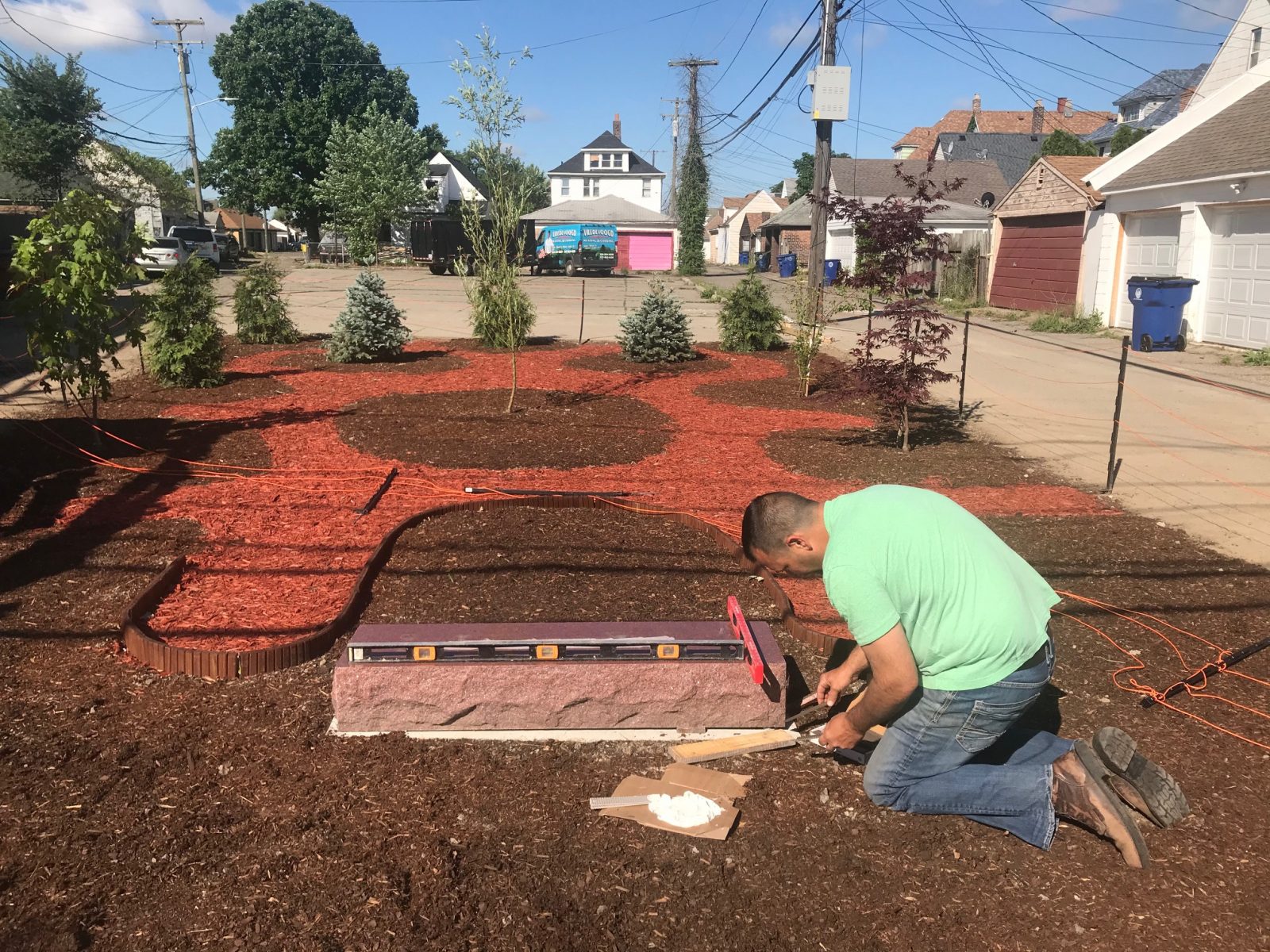 After Memorial Stone was placed, the work moved upfront planting evergreen shrubs.