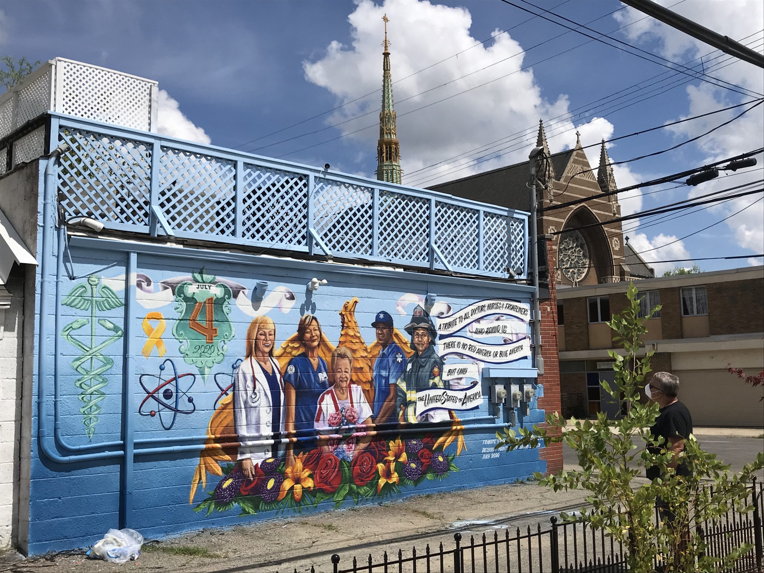 Jake designing the concept of the mural: doctors, nurses, firefighters, EMTs protecting seniors.