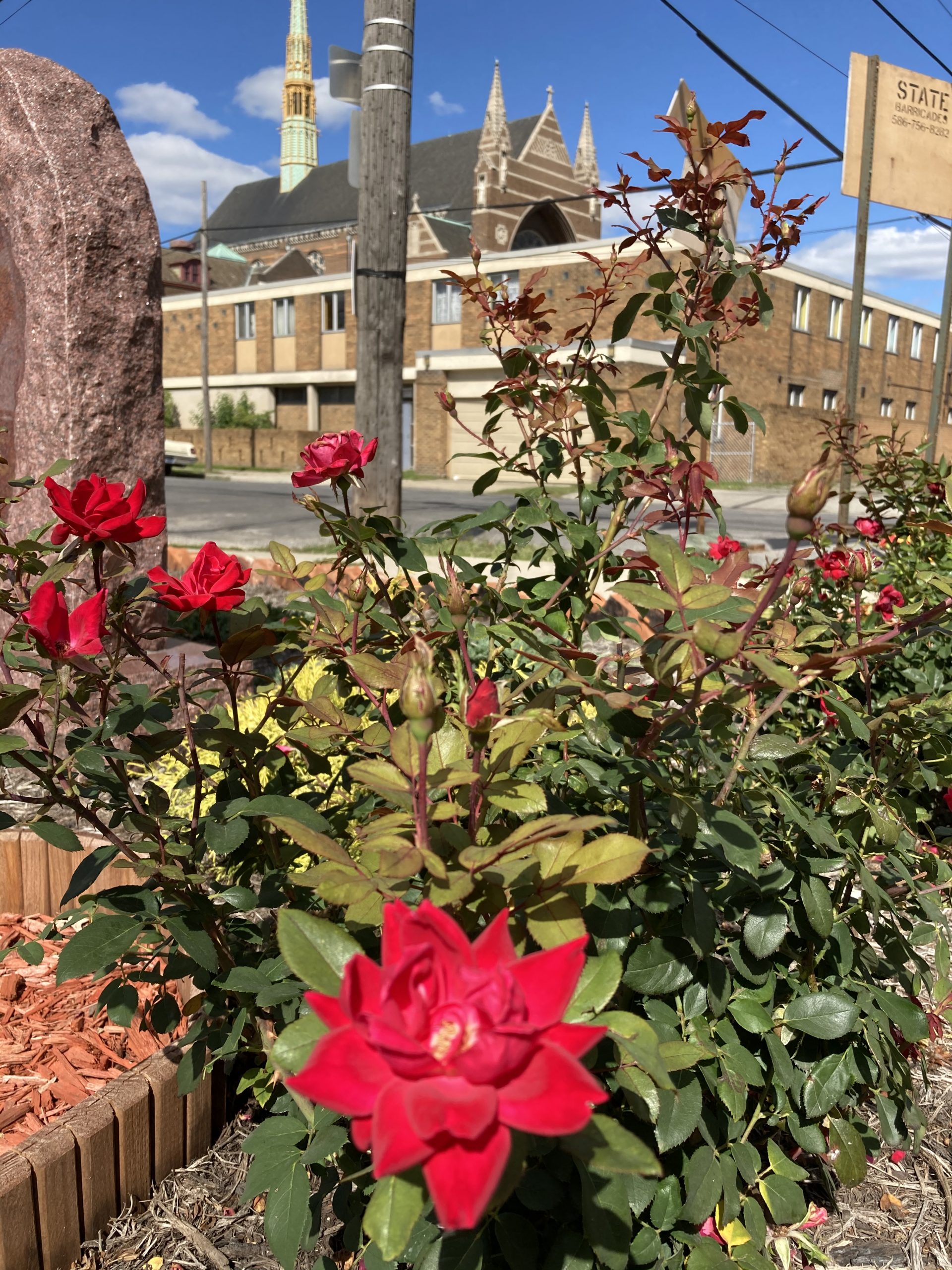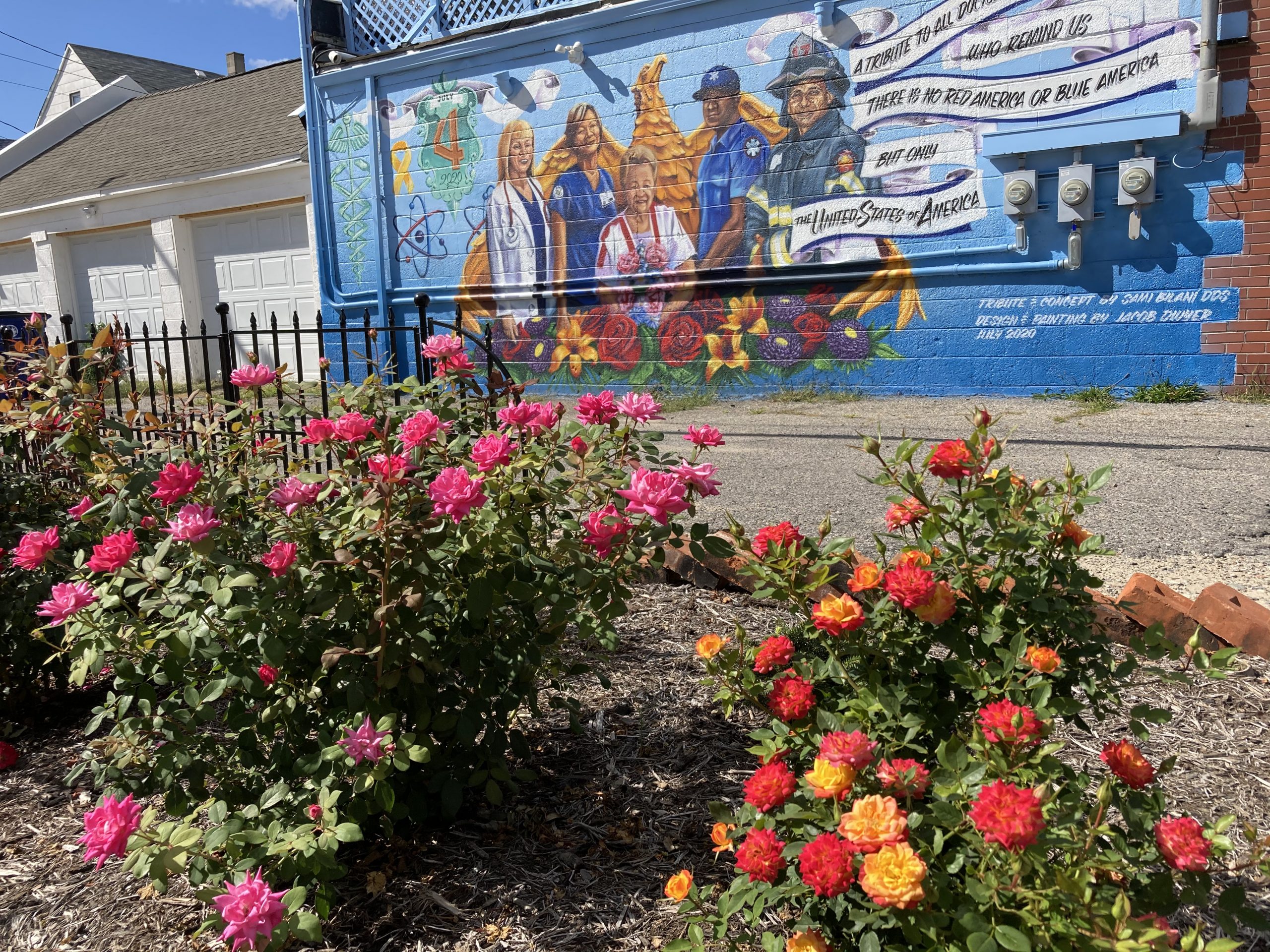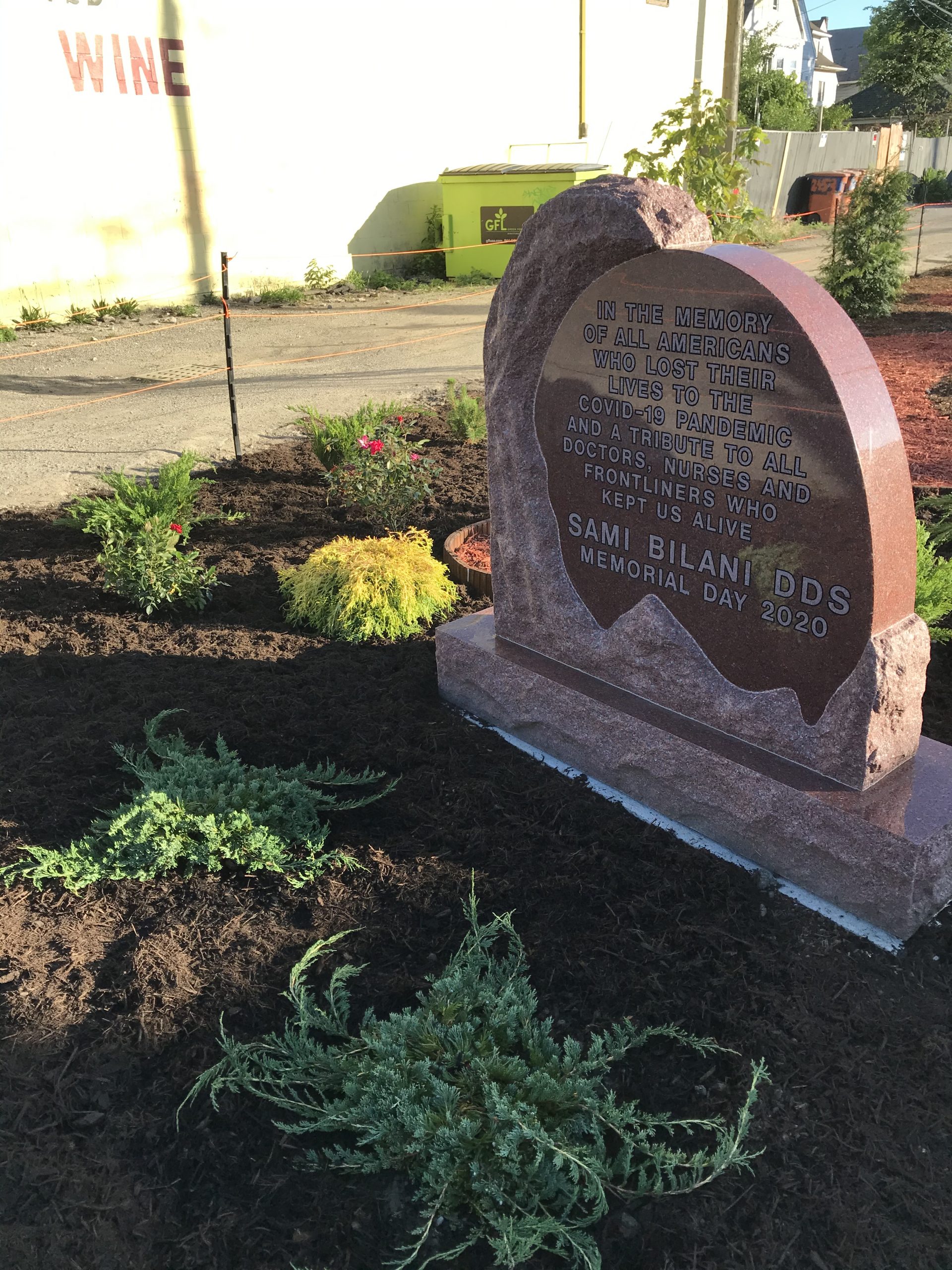 In the summer of 2020 the USA suffered more than 100,000 deaths due to Covid-19. Seniors were affected the most. Doctors, nurses and frontliners were risking their lives trying to save lives. In the memory of the lost Americans and as a tribute to all doctors, nurses and other front-liners, Dr.Bilani decided to build a memorial garden on part of the Florian Dental parking lot. The project started by breaking the concrete, changing the topsoil, and planting trees, roses and mulching on between. A marble stone was erected on the Memorial Day of 2020 and the Mural was finished on July 14, 2020.