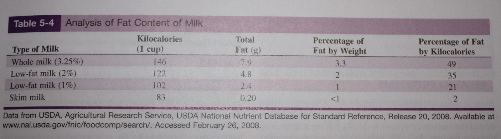 The percentage of fat by weight is widely used on food labels and advertising. Although this information is correct, it is misleading to the American public. The recommendation that fat intake should be limited to 35% refers to the percentage of fat based on the total kilocalories of the product. As shown below, the percentage of fat in whole milk is 49% of the total kilocalories, not 3.25% as the label indicates.