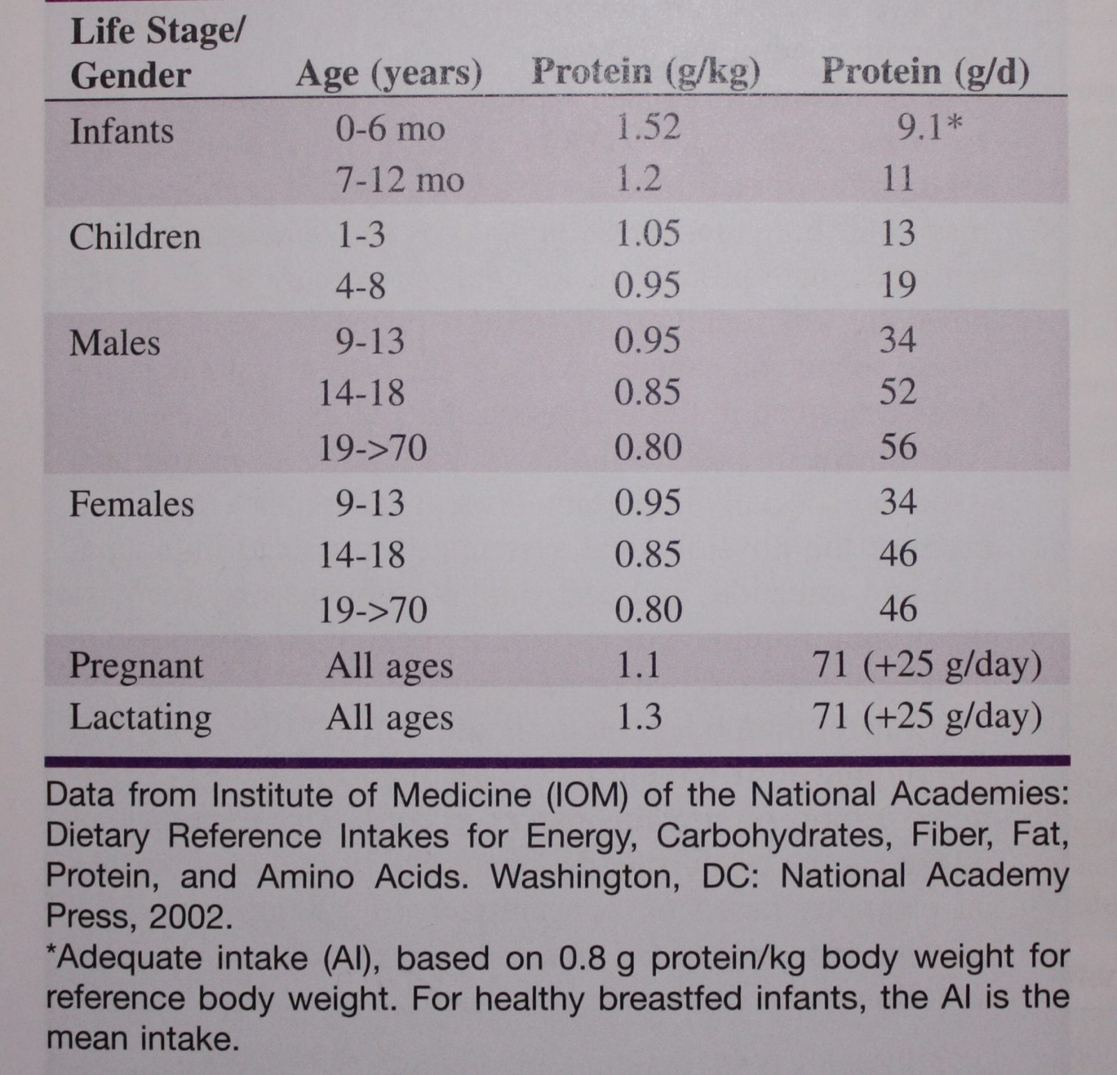 The recommended dietary allowances (RDAs) for protein vary proportionately for different ages and stages of life to adjust for growth rates. The Institute of Medicine (IOM) has determined the daily minimum requirement of protein for adults is about 0.6 g/kg. Using 0.6g/kg, a patient weighing 150 lb (68.2kg) would require 41 g of protein. Because RDAs provide a margin of safety, the IOM has established 0.8g/kg daily as the RDA. With this standard, a patient weighing 150 lb (68.2 kg) requires 56 g protein. The RDAs for protein for various stages of life are listed below.
